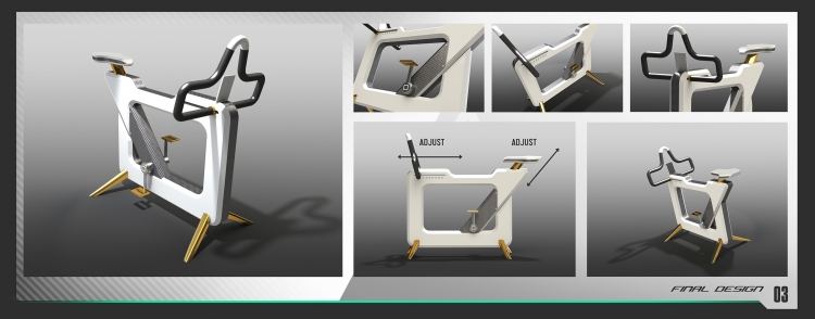 Nowoczesna forma trenażera jest zainspirowana wysokiej jakości sprzętem elektronicznym. Stonowana kolorystyka i wyeksponowane włókno węglowe podkreślają zaawansowanie techniczne produktu, oraz nadają futurystycznego wyglądu. Trenażer regulowany jest w dwóch płaszczyznach.