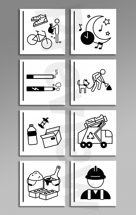 Jako, że piktogramy potencjalnie zakazują (np cisza nocna) to proponuję też dodać ? nad obrazkami. W wytycznych nie pisało, że ma to być "zakaz". Więc piktogramy do podglądu z potencjalnymi zmianami :) Do decyzji organizatora konkursu.