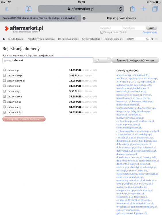 Dzień dobry, zamieszczam zrzut ekranu ze strony do rejestrowania domen na potwierdzenie dostępności domen dla nazwy „żabawki”
