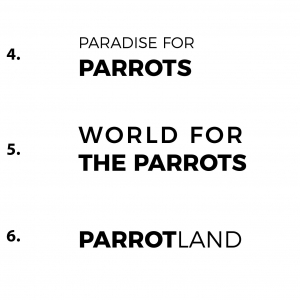 Proszę NIE podawać pustych, nic nie znaczących nazw. Musi ona być łatwa do zapamiętania i natcyhmiast kojarzyć się z papugami (ewentualnie ze sklepem i hurtownią dla papug). Nazwa musi być też łatwa do wypowiedzenia (to może być gra słów albo słowa dobrze się kojarzące, wzbudzające zaufanie).