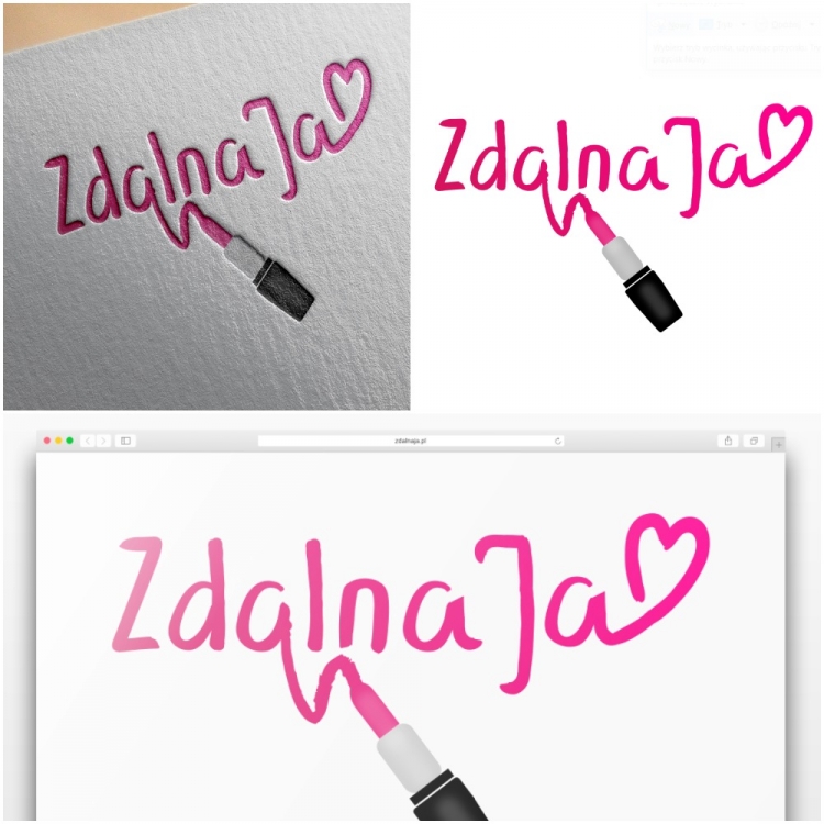 Zdalna Ja: Zaproponowane logo sklada się z części literniczej połączonej z ilustracją szminki. Nazwa 'Zdalna Ja' nawiązuje w oczywisty sposób do działalności firmy, ponieważ marketing internetowy polega na zdalnej pracy. Co więcej, na pierwszy rzut oka napis wygląda jak 'Zdolna Ja' co sugeruje spryt użytkowniczek serwisu. Kluczowym elementem jest tu szminka, która stylizuje litere 'o' na 'a', nadając nazwie głębi i zmieniając znaczenie. Użyte kolory (róż, srebro i czerń) są kobiece i doskonale komponują się z oryginalną, odręczną czcionką, która wygląda jak pisana szminką. Każdy element projektu jest szczegółowo przemyślany i nieprzypadkowy. Całość jest niepowtarzalna, funkcjonalna i inspirująca. Domena zdalnaja.pl jest wolna.