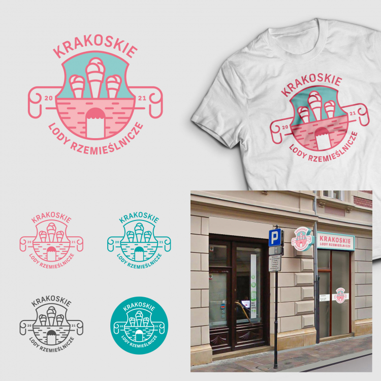 Szanowni Państwo, zapraszam do zapoznania się z moją propozycją nazwy i logo: "KRAKOSKIE". Nazwa nawiązuje do charakterystycznego dla regionu "zjadania" głoski W w końcówce -ski/-ska, które często słyszymy przy wymawianiu przez krakowian nazwisk oraz nazw ("rynek krakoski, powiat rzeszoski, minister Szumoski). Forma natomiast odnosi się do herbu miasta Krakowa, w którym mury miejskie zamiast wież mają lody, a brama zamiast brony ma markizę. Kolorystyka ma związek z branżą cukierniczą – róż oraz miętowy. Logo nadaje się – po niezbędnych technicznych modyfikacjach – na neon, również bez problemu w wersji monochromatycznej poradzi sobie z ustawą krajobrazową. Na wizualizacji pokazuję propozycję koszulki dla sprzedawców oraz witrynę lodziarni na ul. Wiślnej.