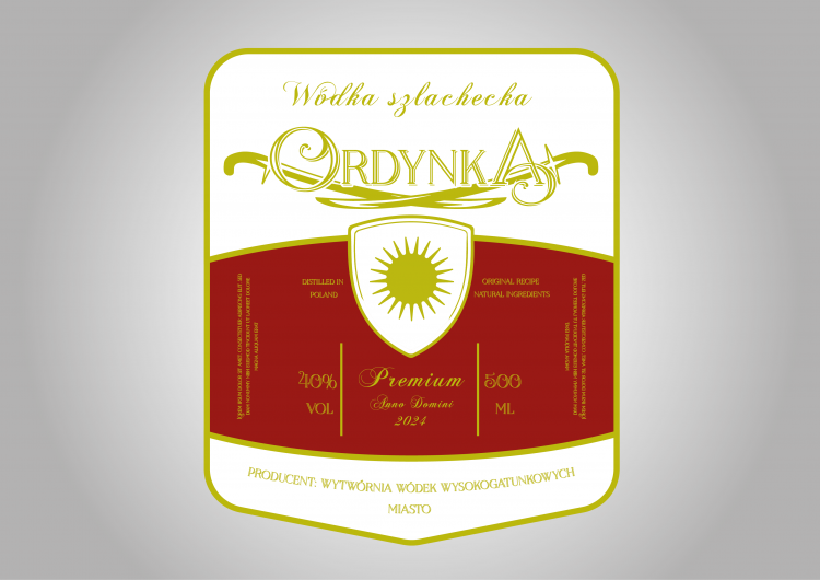 W skład znaku, który zaprojektowałem wchodzi treść : Wódka szlachecka ORDYNKA, wraz z szablami i herbem. Umieściłem w tym miejscu domyślny znak w postaci słońca ( zamiennie z logo Państwa wytwórni). Na rynku znajduje się mnóstwo alkoholi nawiązujących nazwą do I Rzeczypospolitej. Postanowiłem zaproponować nazwę szabli szlacheckiej. Według mnie znaczenie nazwy wiąże się z jakością alkoholu ( mocny, szlachetny, dla prawdziwych mężczyzn, którzy idą w ogień, są waleczni ;) )