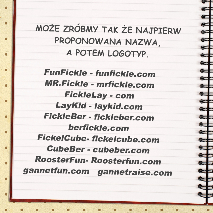 Może zróbmy tak że najpierw proponowana nazwa, a potem logotyp. FunFickle - funfickle.com MR.Fickle - mrfickle.com FickleLay - com LayKid - laykid.com FickleBer - fickleber.com berfickle.com FickelCube- fickelcube.com CubeBer - cubeber.com RoosterFun- Roosterfun.com gannetfun.com gannetraise.com