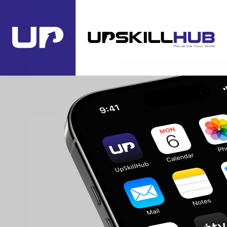 Przygotowałem logotyp platformy e-learningowej o nazwie UpSkillHub. Nazwa złożona z „UpSkill” — podnoszenie kwalifikacji, „Hub” — centrum, społeczność. Ma nawiązywać do założeń platformy. Logotyp posiada strzałkę wskazującą na rozwój, zaś kolorystyka trzyma znak w profesjonalnym tonie. Przedstawiam również wizualizację ikony aplikacji dla platformy, jako potencjalną wizję rozwoju przedsięwzięcia.