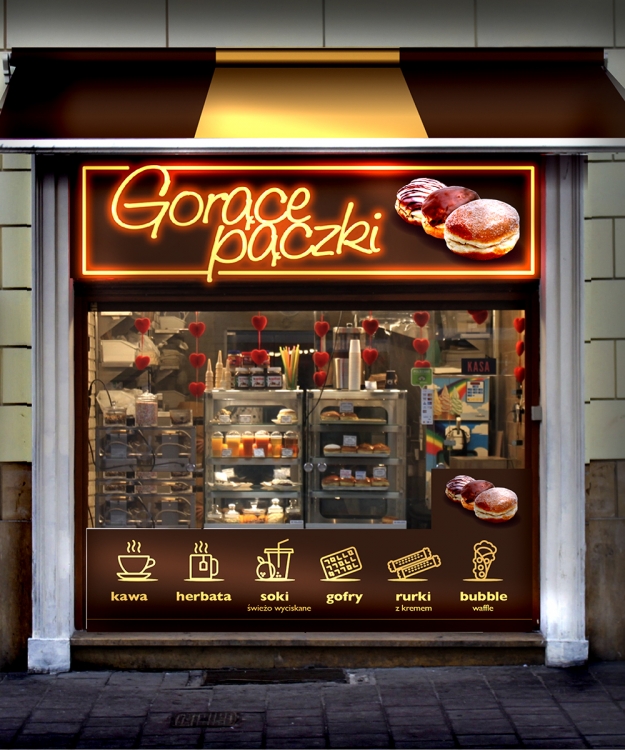 Witam, mój lokal znajduje się w tak zwanym parku kulturowym miasta Krakowa co oznacza, że istnieje bardzo restrykcyjne podejście do reklam. Reklamy musza być stonowane, światło w reklamie może być WYŁĄCZNIE białe. Uwagi: Napis Gorące Paczki musi być stanowczo zrobiony prostą czcionką - bardzo łatwo czytelną bez żadnych udziwnień. Napis ma być w wykonany w technologi liter 3D LED. Poniżej u góry na szybie chcę aby był wąski pasek z napisem: GORĄCE ŚWIEŻE PĄCZKI ROBIONE NA MIEJSCU W szybie po prawej nad okienkiem ma być napis KASA. Dolna reklama ma być technicznie jako naklejka - nie bedzie podświetlana. Bardzo ważne to to aby było widać od razu że jest to pączkarnia z GORĄCYMI PĄCZKAMI. Dodatkiem w sprzedaży są gofry, bubble waffle, rurki z kremem, świeże soki, kawa, herbata.