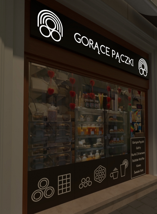 Górna część to podświetlany baner. Dolna część w postaci tablic, pojedynczego banera lub naklejek na szybę. Jest też możliwość podświetlenia. Baner świeci jedynie w miejscu wyciętych napisów i symboli. Wizualizacja sporządzona z globalną iluminacją, pokazująca finalny efekt.