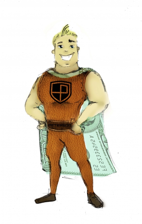 SuperPeterson jak na razie najbardziej nas cieszy. Jeśli mają Państwo ochotę, prosimy o wersję z cylindrem z monet na głowie bohatera oraz może inne pomysły na ubiór bohatera. Tarcza na piersi powinna być metalowa, jak nasze metalowe logo używane dla portfeli.