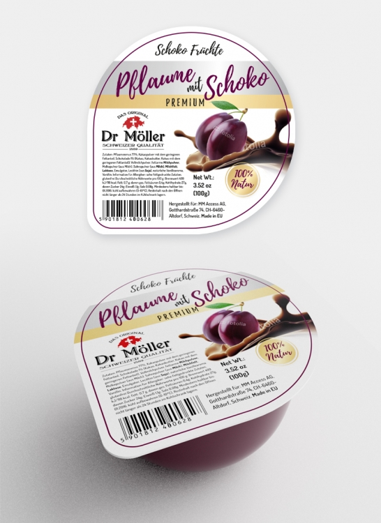 Bardzo ładny projekt i podoba mi się. Eksponuje nasze logo co jest dla nas ważne. Prosto czytelnie. Ładnie oddana inspiracja polskim Dr. Witt, dziękuje. Mam tylko kilka takich uwag trochę technicznych. W katalogu Inspiracje dodałem zdjęcie pokazujące nasz produktu normalnie kupiony w sklepie, żeby widzieć jak wygląda przeciętny kubeczek musu po obróbce handlowej :), a i tak to jest ta wersja ładniejsza, wiele innych jest jeszcze bardziej pozaginanych . Z tym się wiąże – kod paskowy zastosowany na tym „trójkąciku” do otwierania pozagina się i będzie nieczytelny na kasie. Co do samego opisu produktu, w inny wersjach projektów, które otrzymujemy, opisy są robione możliwe niedużą czcionka i w tym wypadku tez moglibyśmy zastosować to samo, nie jest to dla nas istotne, natomiast podoba mi się zastosowanie przez Państwa, w osobnym miejscu opis Hergestelt für….. i adres firmy bo to akurat podkreśla nasza „szwajcarskość” ciekawe podejście do sprawy i podoba mi się , ale nie jest to sprawa najważniejsza dla nas. Może wykorzystać ten „trójkącik” na miejsce do napisania 100g , po przemyśleniach chcielibyśmy tez gdzieś umieścić www.dr-moller.ch. W kilku propozycjach ludzie umieścili to ponad kodem paskowym, lub właśnie na tym trójkąciku – tak jak w polskiej wersji produktu. Nad samym logo tez możemy trochę popracować żeby wyglądało odpowiednio do produktu, to taka podpowiedz jeśli wygląd etykiety zmieniłby się po tej korekcie. Na stronie konkursu jest tez znaczek 100% natur, a dodałem do tego katalogu INSPIRACJE dodałem tez taki znaczek jaki można wykorzystać, ważne żeby był zielony. Przykładowo umieściłem w INSPIRACJE zdjęcia owoców w czekoladzie, chodzi o to żeby była widoczna czekolada na owocu , ale żeby czekolada była tylko dodatkiem a owoce nie pływały w czekoladzie, czekolady w produkcie jest tak naprawdę 10% całości i chciałbym taka sugestie przekazać obrazem. Oczywiście traktuje te zdjęcia jako poglądowe , nie maja być te akurat. WAZNE -nasze produkty chcemy tez sprzedawać na rynek azjatycki a z powodu inności tamtejszych nacji chciałbym żeby wiedzieli dokładnie o czekoladę a nie jakiś inny dodatek.