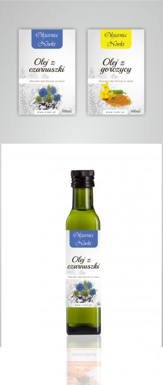 Poproszę o wizualizacje dla innych olejów, z tym że element z napisem 'Olejarnia Niwki' był taki sam jak w pracy #113957. Warto by wówczas dodać jakiś inny element koloru związany z danym rodzajem oleju.