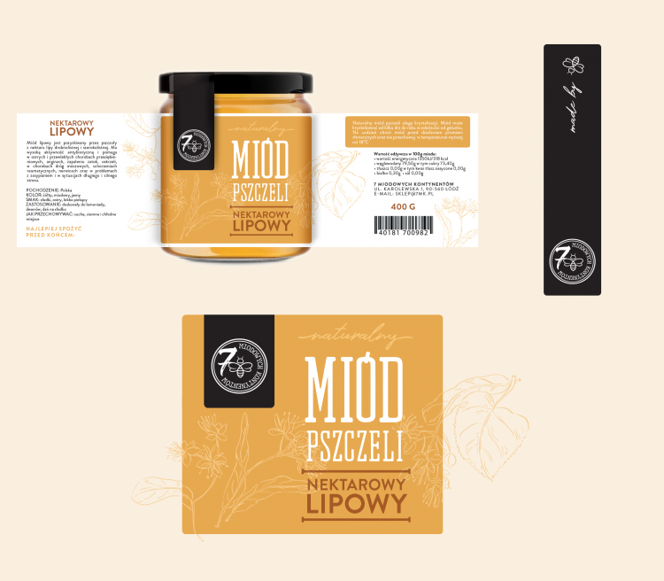 Dzień dobry, przedstawiam projekt etykiety dla miodu marki 7 Miodowych Kontynentów. Etykieta bazowa składa się z ciepłej palety barw nawiązującej do koloru miodu i natury, kontrast w postaci czerni i bieli ma na celu nadania produktowi charakteru premium. Odręczny rysunek kwiatostanów i liści rośliny z której pozyskiwany jest miód ma podkreślić naturalne pochodzenie produktu. Banderola to dodatkowy element graficzny, w który idealnie wpisuje się logotyp, hasło i znak graficzny pszczoły . W przypadku serii, elementami zmiennymi będzie kolorystyka i odręczny rysunek.