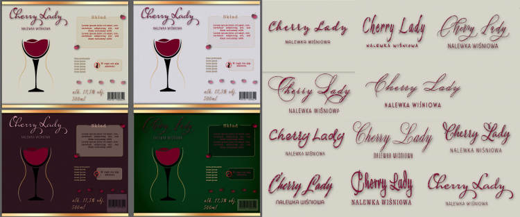 4 przykładowe warianty kolorystyczne, w tym zielony dla porównania. Czcionki są losowo dobrane w pary, proszę o informację która (jeśli któraś) przypadła Pani do gustu, osobno dla hasła "Cherry Lady" i "nalewka wiśniowa". Najlepiej podać je w sposób np.: rząd 1. od góry, druga od lewej. Sprawdziłam wiele opcji kolorystycznych dla tła i te zaprezentowane wydają mi się najlepsze. Proszę o uwagi :)