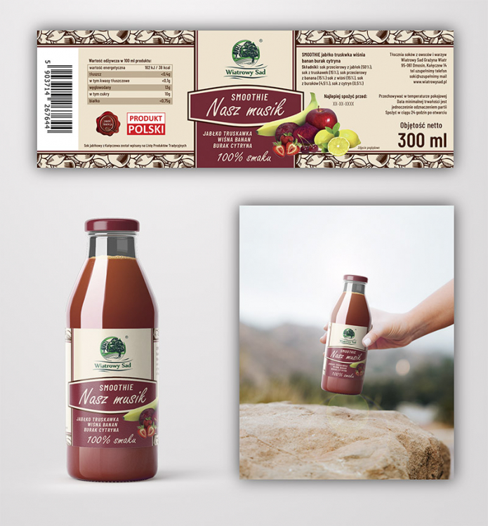Propozycja graficzna nawiązuje do tradycji firmy oraz istniejących już etykiet. Kompozycja owoców i warzyw widoczna na zdjęciu poglądowym może zostać zmieniona, w zależności od potrzeb czy też składu innych produktów z serii Smoothie. Kolorystyka również nawiązuje do smaku - ze względu na buraka, truskawki, wiśnie uważam, że smoothie będzie miało prawdopodobnie kolor ciemnoczerwony / bordowy, dlatego tak też została zaprojektowana etykieta, aby współgrać z kolorem prześwitującym przez szkło butelki. W razie innego składu, kolorystyka również może nawiązywać do innej kompozycji smakowej. Całemu projektowi przyświecała idea stworzenia produktu spójnego względem poprzednich etykiet oraz podkreślającego rodzinny charakter Państwa Firmy. W razie chęci wprowadzenia poprawek w projekcie proszę się ze mną skontaktować, chętnie dokonam proponowanych zmian.