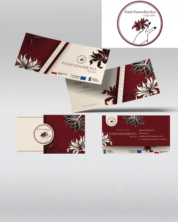 Cześć! Kwiat w logo to Red Spider Lily, inspirowany motywem z anime - nawiązanie do Twoich zainteresowań, o których wspominałaś w briefie. Ze względu na wymogi dotyczące oznaczeń Unii Europejskiej, które muszą znajdować się na projektach, a nie mogą być mniejsze niż Twoje logo, zdecydowałam się wykorzystać właśnie kwiat z logo jako charakterystyczny, rozpoznawalny element wizualny. Dzięki temu projekty pozostają spójne z Twoją identyfikacją, a jednocześnie spełniają formalne wymagania. Kolorystyka, typografia i inne elementy mogą zostać oczywiście dopasowane do Twoich preferencji.