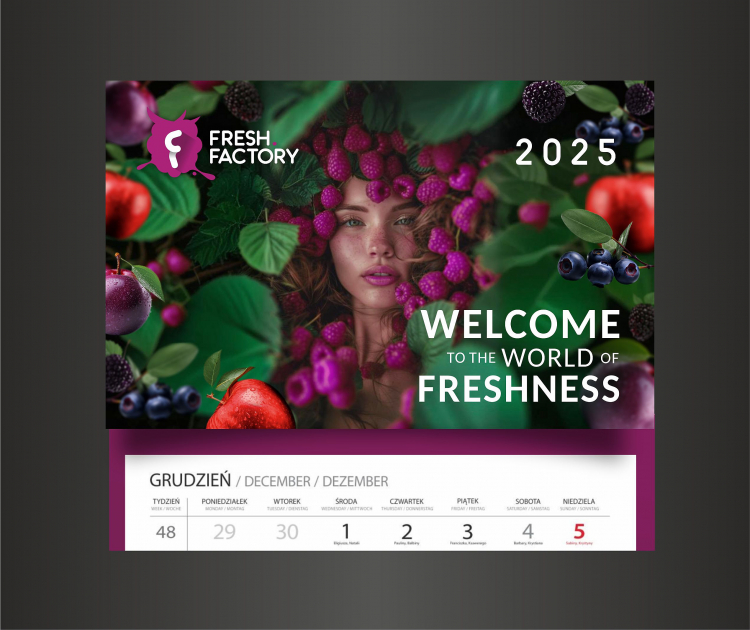 W spojrzeniu modelki jest coś magicznego - zaproszenie do zanurzenia się w świecie świeżych owoców. Przekaz jest bardzo jasny a jednocześnie nienachalny. Kolor malin dopasowany do kolorystyki logo, przeplatany ciepłym odcieniem zieleni, granatu oraz mocnym akcentem rumianej czerwieni. Całość kompozycji dynamiczna a zarazem uporządkowana. Napis wyraźnie i czytelnie wyeksponowany w prawym dolnym rogu. Jeśli są korekty - zapraszam do kontaktu. Jakie informacje mają się znaleźć na pleckach? Czekam na wiadomość