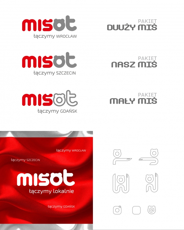 Dzień Dobry Państwu, Dosyłam jeszcze drugą wersję kolorystyczną logo opartą na zastosowaniu koloru szarego, który dodaje profesjonalizmu i szlachetności. Zastosowałam w tej wersji inne nazwy pakietów. Ale nadal nawiązują one do ikonki misia - jest to jednak nawiązanie bardziej bezpośrednie. Typograficznie i kolorystycznie system pakietów może być oczywiście modyfikowany. Elementem innowacyjnym w tej wersji jest rozszerzenie claimu "łączymy lokalnie" na konkretne miasta. może to być przydatne w przypadku rozszerzania oferty na inne miasta w Polsce. Hasło to pojawia się w przykładowej reklamie. Dodałam także inne konfiguracje ikonki misia i znaczki interenetowe, które są częścią składową systemu SIW. Ikonmi te mogą być specjalnie modyfikowane pod konkretne zastosowania. Mogą także układać się w jakieś konkretne obrazy (pokazałam to w poprzednim mailu na przykładzie kształtu Polski), może to okazać się przydatne w reklamach facebookowych lub prasowych. Jeśli będą mieć Państwo jakieś uwagi bądź spostrzeżenia proszę o komentarze. pozdrawiam Anna