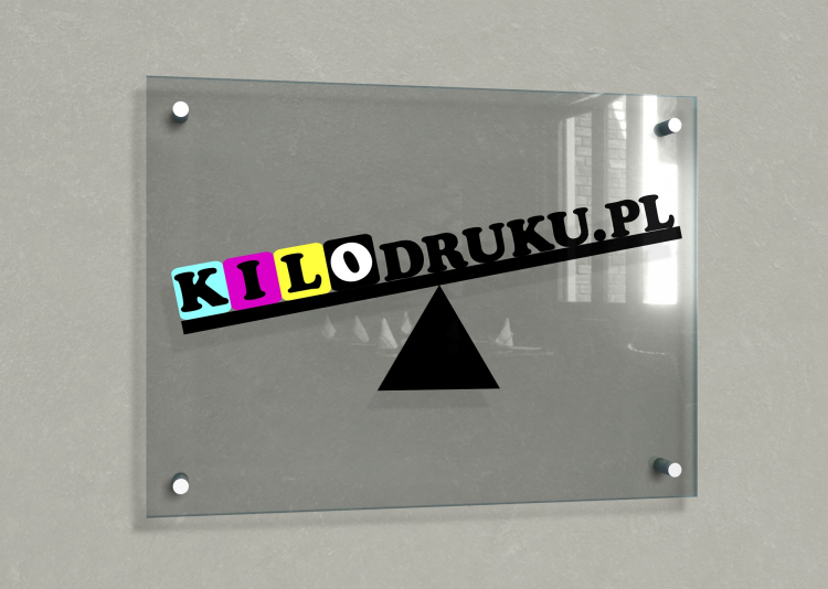 Moja propozycja: firmowe logo umieszczone jest na wadze. Litery KILO są odważnikami i waga pod wpływem ciężkości liter KILO przechyla się. Kolory kwadratów przedstawiają podstawowe kolory farb drukarskich- cyjan, magenta, żółty i czarny.