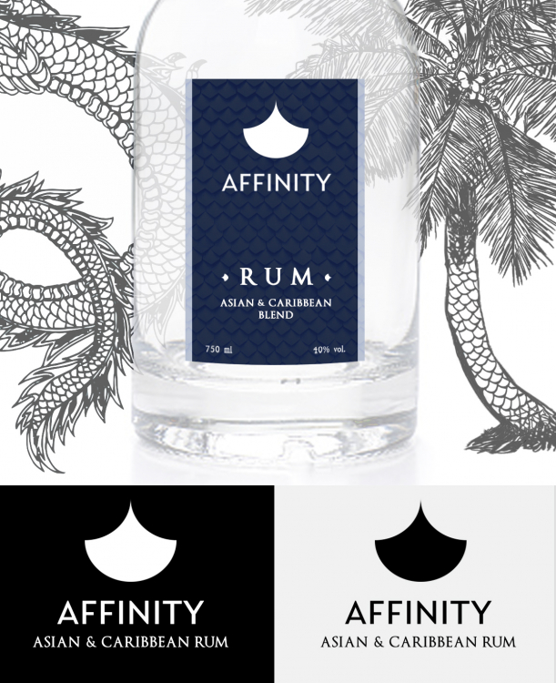 Minimalistyczne logo nawiązuje do orientalności rumowego blendu oraz samej nazwy trunku - Affinity (pol. pokrewieństwo, bliskość). Ideą jest przedstawienie sygnetu jako znaku podobnego (afinicznego) do litery ,,A''. Wyjściowa kolorystyka zestawiona z dobrze dobranymi krojami pisma może tworzyć elegancką i oryginalną całość na butelce z rumem. _propozycja_2