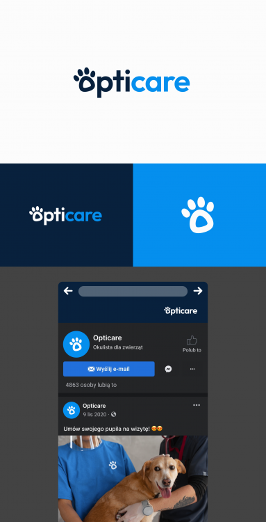 Prosty, minimalistyczny logotyp, będący graficzną interpretacją łapki pupila. Poniżej znajduję się mockup strony facebooka