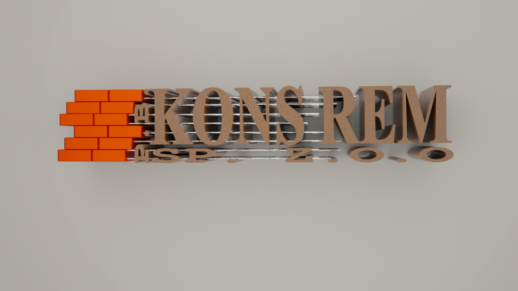 projekt logo z wykorzystaniem blendera. Przedtsawia nazwę firmy jakby stworzoną na różnych etapach budowy od zbrojenia, po cegły i elewację.