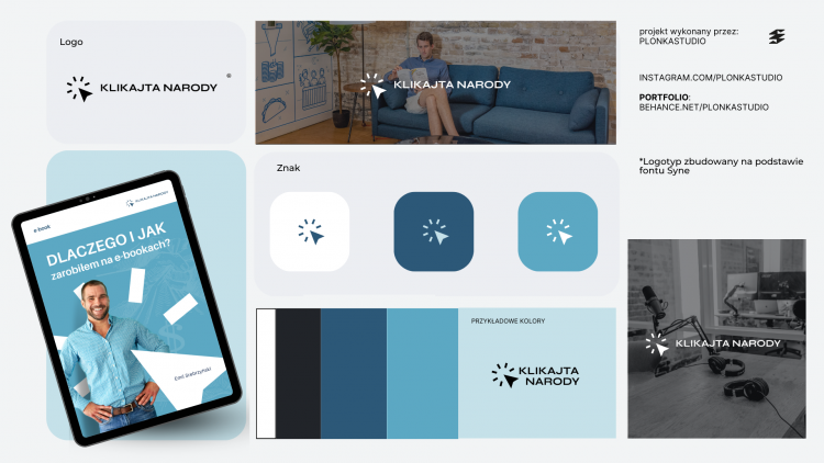 Logo dla KLIKAJTA NARODY. Motyw jest prosty i minimalistyczny. Przy projektowaniu znaku skupiłam się na motywie kliknięcia ze względu na opis działalności. Wykorzystuje on typowy wskaźnik CTA, który zachęca do niczego innego jak klikania :) Kolorystyka oparta na tonach niebieskich ze względu na rozwojową tematykę, a niebieski z tym właśnie mi sie kojarzy. Na obronę znaku - jest on prosty i łatwy do zapamiętania a ponad to można go fajnie wykorzystać w materiałach reklamowych itp jak np na załączonym mockupie ebooka (grafika-tablet) ; przez co tym bardziej możemy utrwalać odbiorcom nasz wizerunek. * Kolorystyka może być inna, to tylko propozycja. ** Font został użyty już z licencją na użytek komercyjny przez co projekt nie zawiera zadnych dodatkowych kosztów. Projekt wykonała Sylwia - PLONKASTUDIO