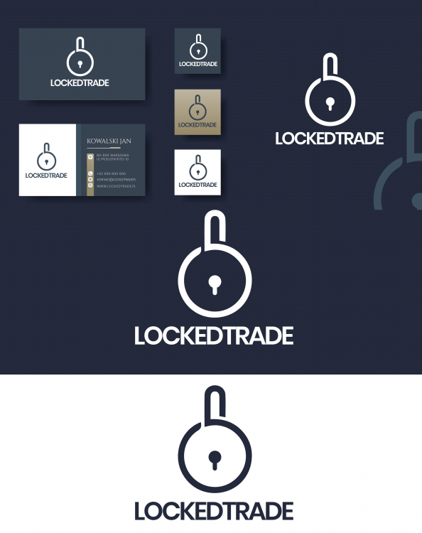 Symbol kłódki: Kłódka symbolizuje bezpieczeństwo i ochronę, co jest kluczowe w branży finansowej. Sugeruje, że usługi firmy są niezawodne i chronią interesy klientów. Forma kłódki jest uproszczona i nowoczesna, co pasuje do innowacyjnego charakteru fintechu. Kolorystyka: Granatowe tło i biały symbol tworzą kontrast, który symbolizuje profesjonalizm i czystość. Granat kojarzy się z zaufaniem, stabilnością i powagą - cechami pożądanymi w finansach. Złoty akcent na jednej z wersji logo dodaje prestiżu i kojarzy się z sukcesem finansowym. Typografia: Prosty, czytelny font w nazwie "LOCKEDTRADE" podkreśla przejrzystość i dostępność usług. Duże litery sugerują solidność i pewność siebie firmy. Minimalizm: Proste, czyste linie logo odzwierciedlają precyzję i klarowność, które są ważne w analizie technicznej. Minimalistyczny design sprawia, że logo jest łatwo rozpoznawalne i zapamiętywalne. Wszechstronność: Logo dobrze prezentuje się w różnych rozmiarach i na różnych nośnikach (wizytówki, aplikacje, strony internetowe). Różne warianty kolorystyczne (biały na granatowym, granatowy na białym, złoty) pozwalają na elastyczne zastosowanie w różnych kontekstach. Nowoczesność: Ogólny styl jest nowoczesny i "tech-friendly", co idealnie pasuje do firmy z branży fintech.