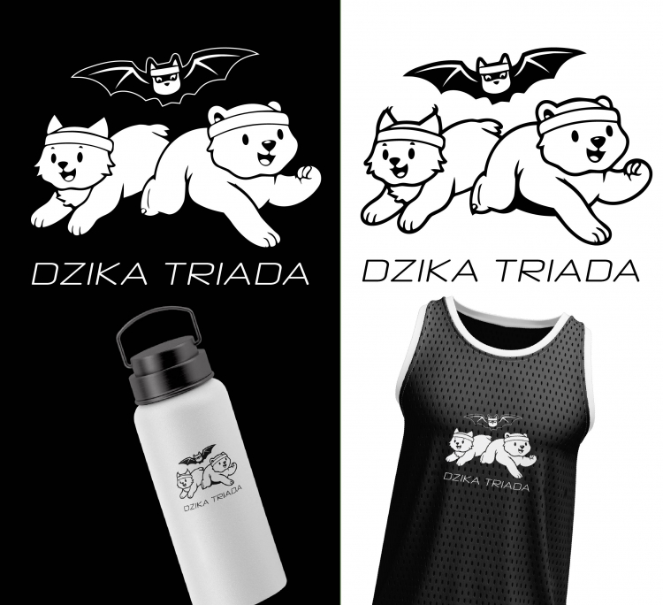 Projekt „Dzika Triada” to dynamiczne, linearne logo przedstawiające rysia, niedźwiedzia i nietoperza w sportowych opaskach, co symbolizuje zwinność, siłę oraz pasję do biegów. Nowoczesna, czarno-biała stylistyka zapewnia doskonałą czytelność i profesjonalny wygląd na koszulkach technicznych, medalach oraz materiałach promocyjnych. Postacie zwierząt nadają marce przyjazny, budzący pozytywne emocje charakter, który integruje społeczność biegaczy i wyróżnia wydarzenie na tle konkurencji.