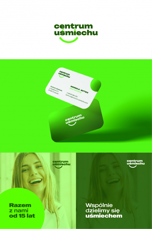 Przedstawiam Państwu odświeżony model logo, który promienieje zielenią. Zamiast szarości zastosowałbym tutaj właśnie kolor ciemnozielony, który jest kontrastującym kolorem wizualizacji. Logo nawiązuje do uśmiechu z samej nazwy, w której "ś" oraz "i" wypełniają buźkę. Podobnie zaprojektowano markę Colgate z podkreśleniem uśmiechu (z którą Państwo macie partnerstwo). Bardzo chętnie zrobię dodatkowe wizualizacje dla Państwa.